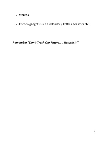 Stereos Kitchen gadgets such as blenders, kettles, toasters etc. Remember “Don’t Trash Our Future….. Recycle It!” 4